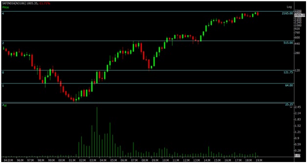 The above performance of SKF INDIA, a Bangalore based company shows the power of compounding. Stock had formed a bottom at 25 levels in the year 2001. One with a basic knowledge of technical’s like supports and resistances on the above chart could have multiplied his investment by 86 times in a span of 18 years or so by capturing the full trend. Hence, all investors should develop patience to make big money by investing in the long term with appropriate risk management in place.